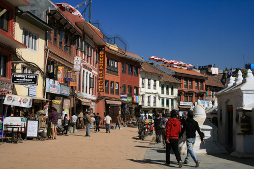 In der Umgebung der Stupa haben sich vor allem Exil-Tibeter niedergelassen. Außerdem gibt es wieder jede Menge Souvenirläden und kleine Restaurants. Wir suchen uns die Dachterrasse eines Restaurants für unsere Mittagspause aus.