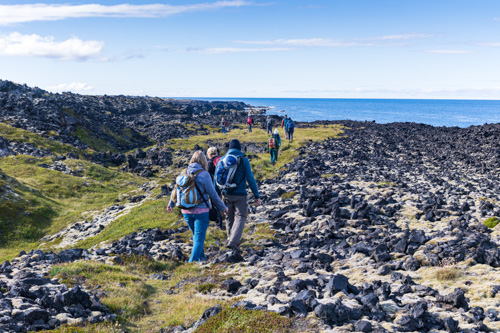 Páll fährt uns zu unserem Startpunkt nach Beruvik. Dann laufen wir immer entlang der Küste zurück Richtung Arnarstapi. Rechter Hand liegt der blaue Atlantik, links thront der Snæfellsjökull. Hier ist Professor Lidenbrock mit seinen Gefährten zur Reise zum Mittelpunkt der Erde aufgebrochen. Wir entschließen uns an der Oberfläche zu bleiben und der Küstenlinie zu folgen.