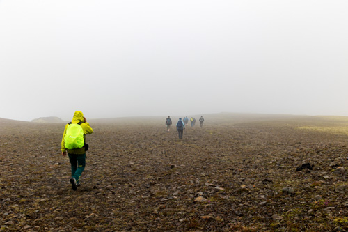 Der Pfad führt uns durch karge Landschaft. Die Wolken hängen sehr tief. Wir sind bei ca. 12 Grad unterwegs. Irgendwann geht der Dunst in Regen über. Zeit die Regenjacken rauszuholen. Doch richtige Wanderer lassen sich von keinem Wetter aufhalten. Weiter gehts über Geröllflächen hinein in die Wolken.