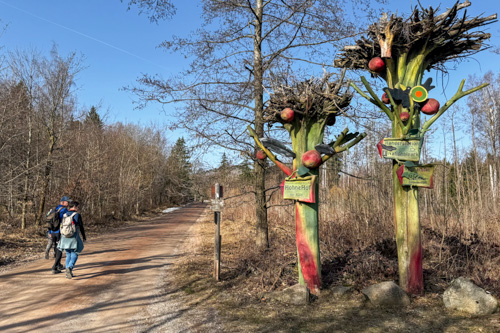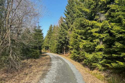 Auf breiten Wegen geht es immer leicht bergauf. Ganz allein sind wir hier heute erwartungsgemäß nicht unterwegs. Das schöne Wetter hat viele Leute in den Harz gelockt. Ab und zu begegnen uns andere Wanderer und vereinzelt überholen uns Mountain Biker. Nach rund 2,5 Kilometern erreichen wir die erste Stempelstelle am Trudenstein (HWN017).