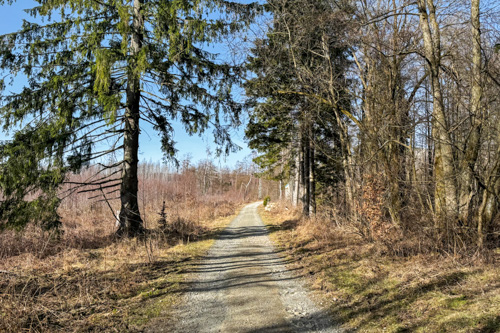 Von nun an beginnt der Rückweg und mit uns gehts bergab. Kurz laufen wir von der Leistenklippe auf gleichen Weg zurück. Doch schon bald biegen wir auf einen anderen Weg ab. Zwischen den Bäumen liegen im Schatten die letzten Schneereste des Winters. Weiter unten sehen wir bald die letzte Stempelstelle des Tages. Am Hohnehof (HWN174) drücken wir Stempel Nr. 3 der Tour ins Heft.