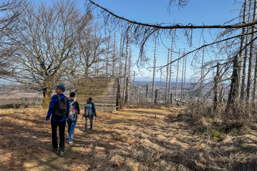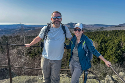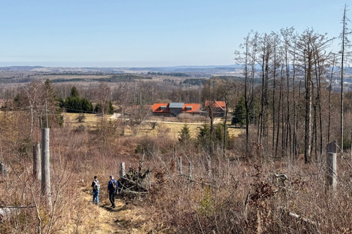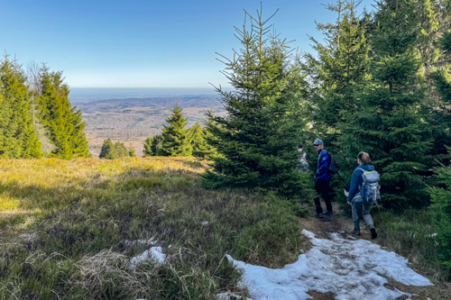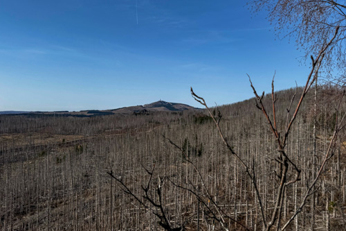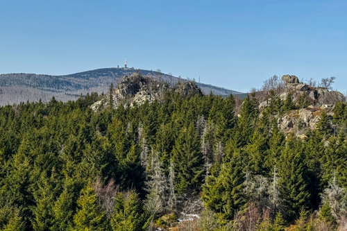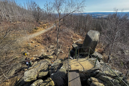 Über kurze Leitern kann man auf den kleinen Felsen hinaufsteigen. Hier haben wir einen prima Blick hinüber zum Brocken und zum Wurmberg. Noch immer sind die Wälder am Brocken tot. So früh im Jahr haben die kleinen nachgewachsenen Büsche auch noch keinen grünen Blätter.
