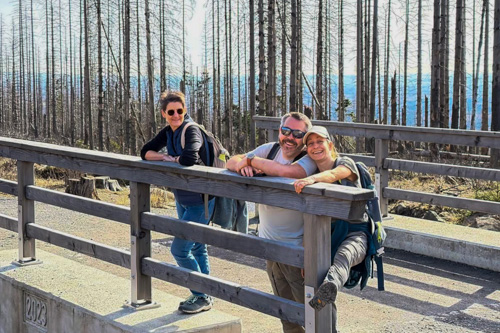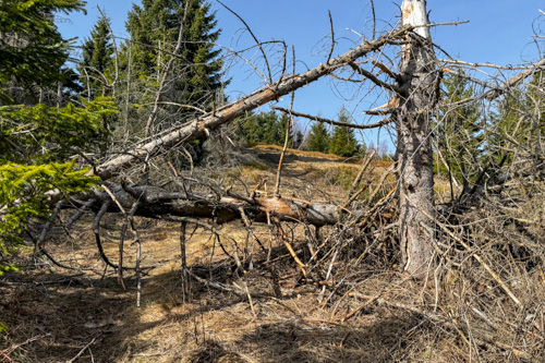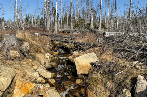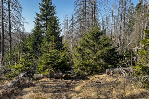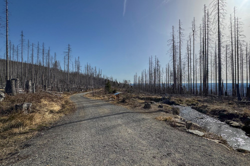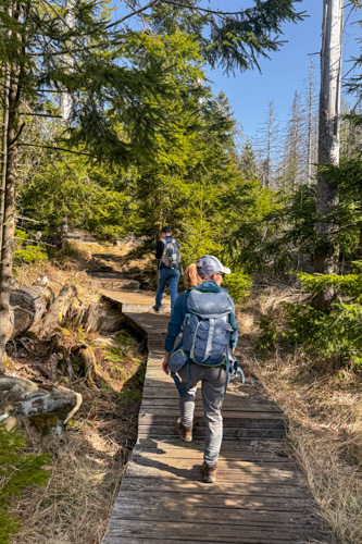Hier oben stehen zwischen den toten Bäumen auch immer mehr grüne Nadelbäume, die irgendwie das Waldsterben im Nationalpark überlebt haben. Das macht den Weg gleich noch viel schöner. Teilweise führt uns der Pfad auf Bohlenwegen über morastiges Gelände.