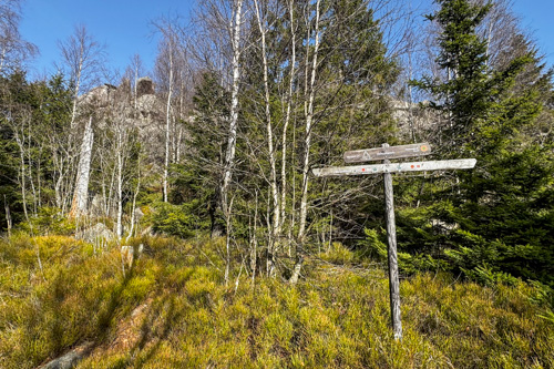 Am Ortseingang biegen wir unweit des Bahnhofes auf den Wanderparkplatz ein. Wir schultern unsere Rucksäcke, die Jacken können bei den frühsommerlichen Temperaturen direkt im Rücksack bleiben. Dann gehts los. Vom Parkplatz aus müssen wir einmal kurz die Hauptstraße und die Bahnstrecke der Harzer Schmalspurbahnen überqueren. Direkt auf der gegenüberliegenden Seite startet der Weg zu unserem ersten Ziel.