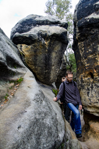 Ganz so schlimm ist der Weg dann doch nicht. Nach diesem kurzen Aufstieg geht es auf gut ausgebauten Wanderwegen über den Schrammsteingratweg weiter. Der Weg windet sich um Felsen. Manchmal muss man sich zwischen diesen hindurchzwängen oder über kleinere Brocken hinweg klettern. Doch alles in allem ist der Weg nicht schwierig.