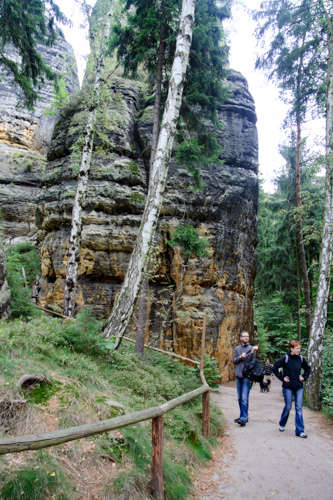 So geht es also aus Schmilka hinaus Richtung Heilige Stiege. Dieser Aufstieg soll uns auf die Schrammsteine hinauf bringen. Doch zuerst geht es gut 2 Kilometer im gemächlichen Anstieg durch ein Waldgebiet. Heute treffen wir auch auf viel mehr Mitwanderer als gestern.
