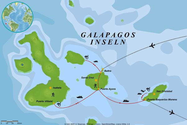 Anschließend fliegen wir weiter in eines der letzten Tierparadiese. Auf den Spuren von Charles Darwin durchkreuzen wir die wundersame Inselwelt des Galapagos-Archipels. Schildkröten, Seelöwen, Meeresechsen, Blaufußtölpel und mit Glück auch Pinguine bekommen wir hier vor die Linse.