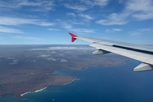 Wir haben einen 2-stündigen ruhigen Flug. Rund 30 Minuten vor der Landung versprühen die Stewardessen in den Gepäckfächern über uns Insektenspray. Ob das wirklich hilft, dass nichts auf die Galapagos-Inseln eingeschleppt wird?