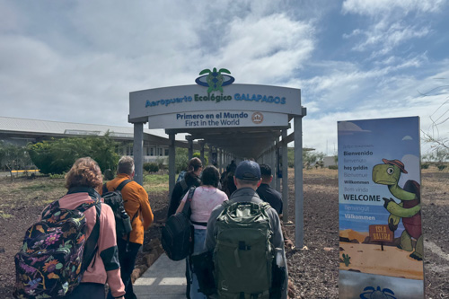 Pünktlich landen wir auf der Flughafeninsel Baltra in Galapagos. Die Einreise geht recht zügig. Wir bezahlen unsere 200 US-Dollar Nationalpark-Gebühr und schon stehen wir vor der Gepäckausgabe. Hier bekomme ich mit, dass andere aus unserer Gruppe einen Stempel in den Reisepass bekommen haben. Den will ich auch! Also spreche ich nochmal eine Dame vom Sicherheitspersonal an und siehe da, ich darf nochmal zurück in den Bereich zu den Einreiseschaltern. Der Herr, der mir vor ein paar Minuten noch die 200 US-Dollar abgenommen hat, drückt mir nun den „Einreisestempel“ in den Pass. Warum macht der das nicht gleich, ohne nachzufragen.