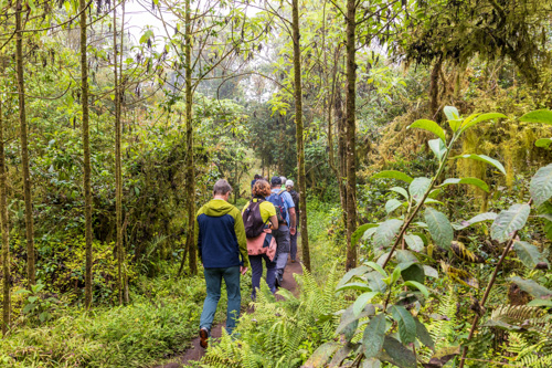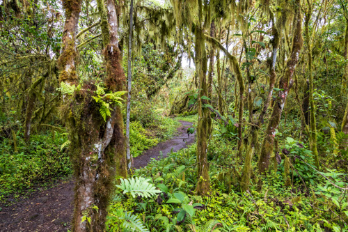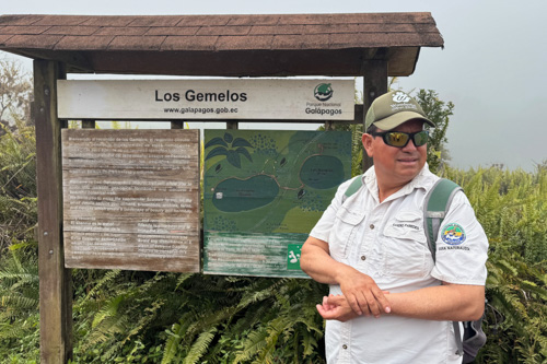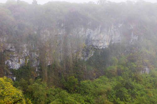 Mit dem Bus fahren wir einmal quer durch die Insel von ganz oben im Norden bis nach unten in den Süden. Unterwegs legen wir einen ersten Zwischenstopp bei den Zwillingskratern Los Gemelos im Hochland auf 600 Metern ein. Hier in der Höhe sind wir schon in den Wolken oder im Nebel. So richtig ist mir das gerade nicht klar. Ich hoffe nur, dass das Wetter die nächsten Tage nicht überall auf Galapagos so ist. Wir unternehmen eine kurze Wanderung durch den Nebelwald zu beiden Kratern.