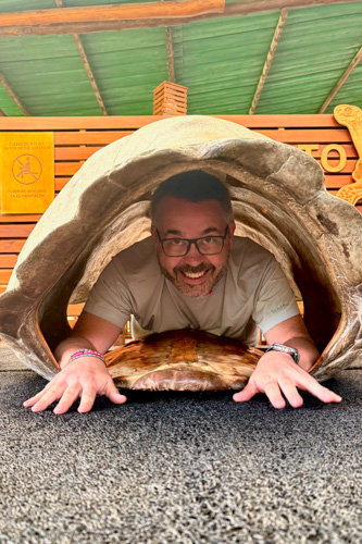 Nach Abschluss unserer Runde durch das Naturreservat kommen wir wieder an dem Restaurant an. Hier können wir noch einen Kaffee trinken. Wer möchte kann noch Schildkröte spielen und in einen der hier ausgestellten leeren Schildkrötenpanzer hineinkriechen.