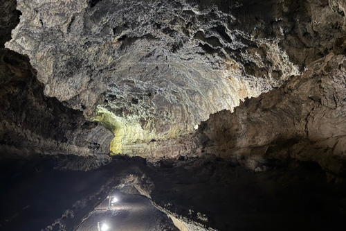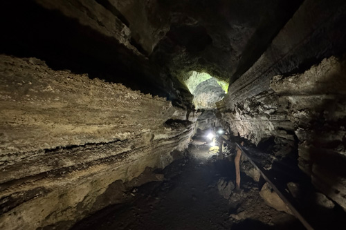 Auf halber Runde durch das Gelände geht es plötzlich unter die Erde. Wir stehen vor dem Eingang zu einem unterirdischen Lavatunnel. Also geht’s erstmal unter der Erde kurz weiter.