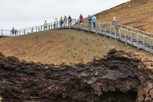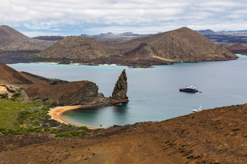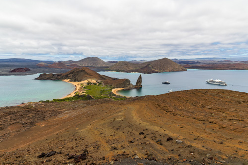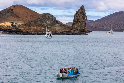 Wir sind ungefähr zweieinhalb Stunden unterwegs, bis wir die Insel Bartolomé erreichen. Hier setzen wir mit einem Schlauchboot von unserem Schiff zur Insel über. In der Bucht liegen noch andere Boote und sogar größere Kreuzfahrtschiffe vor Anker.