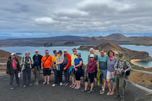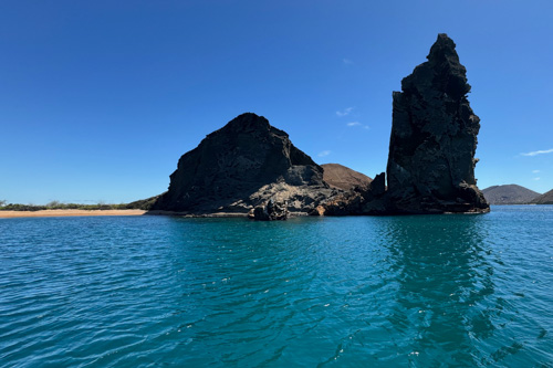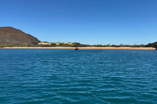 Nach dem obligatorischen Gruppenfoto geht’s wieder zurück zum Schiff. Mit dem Schlauchboot setzen wir auf unser Schiff über. Anschließend fahren wir die Küste entlang, am Sandstrand und dem Pinnacle Rock vorbei. Wir schauen uns die Gegend erst einmal vom Boot aus an.