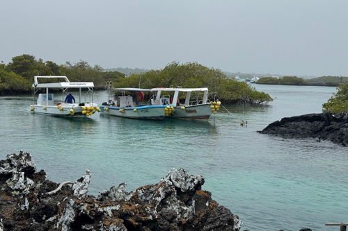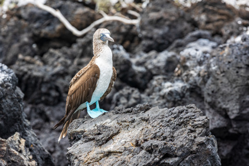 So ausgestattet geht’s runter zum Hafen. Unser kleines Boot und der Guide warten schon auf uns. Wir fahren zu den kleinen vorgelagerten Inseln Tintoreras. Mit dem Boot geht’s immer an den Inseln entlang. Wir können die verschiedensten Vögel beobachten. Auf dem Lavagestein sitzen mehrere Blaufuß-Tölpel. Deren blauen Füße leuchten schon von weitem.