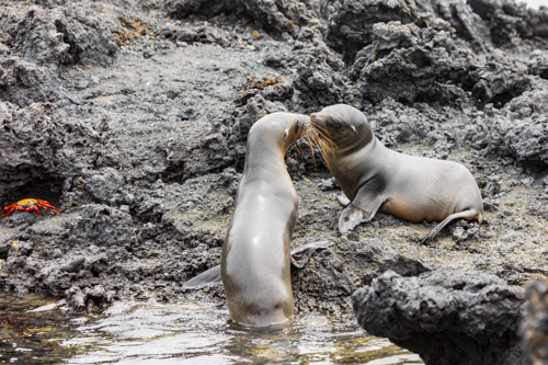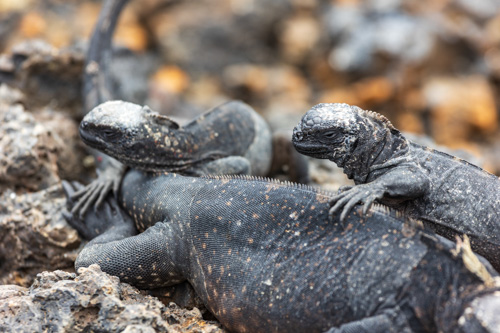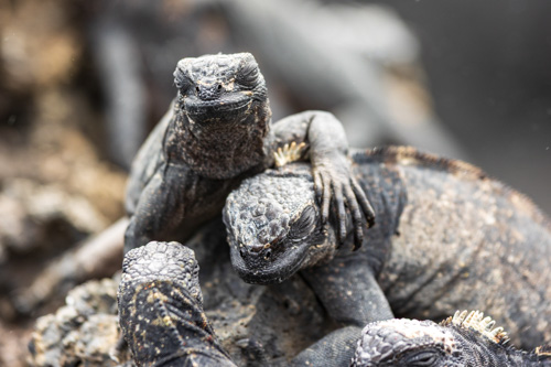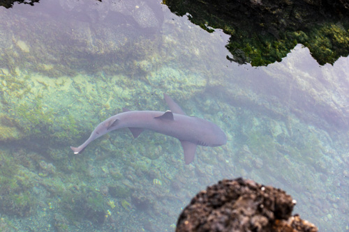 Wir legen an einem kleinen Steg an der Insel an. Auf markierten Wegen laufen wir über die Insel und können erneut viele Meerechsen beobachten. In einen kleinen Kanal liegen mehrere Weißspitzenriffhaie im Wasser und schlafen.