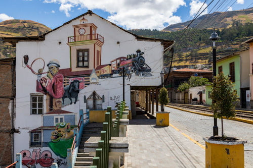 Im Zentrum befindet sich ein alter Bahnhof. Aktuell ist die Bahnstrecke nicht im Betrieb. Früher fuhren hier die Züge durch und weiter bis nach Quito. Wir laufen durch den Ort, schauen uns den alten Bahnhof an und laufen durch schöne alte Gassen mit vielen kleinen, bunten Häusern. Mir gefällt das Örtchen sehr gut. Die kleinen Häuser und schmalen Gassen versprühen einen besonderen Charme.